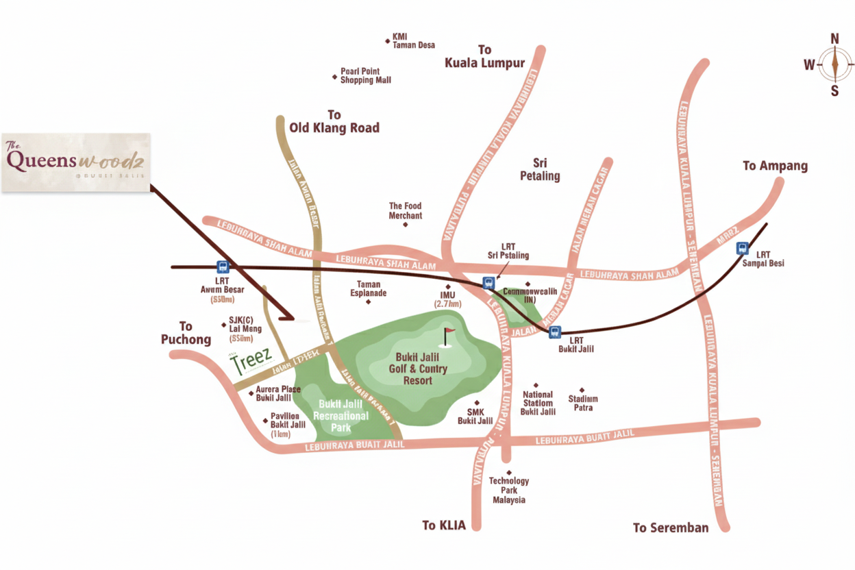Queenswoodz is well connected via major highways including KESAS, MEX Highway, and the Bukit Jalil Expressway, providing convenient access to Kuala Lumpur, Petaling Jaya, Putrajaya, and other key areas across the Klang Valley.